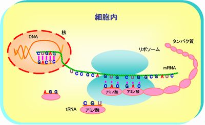 DNAの遺伝情報により細胞内でタンパク質を合成する事。